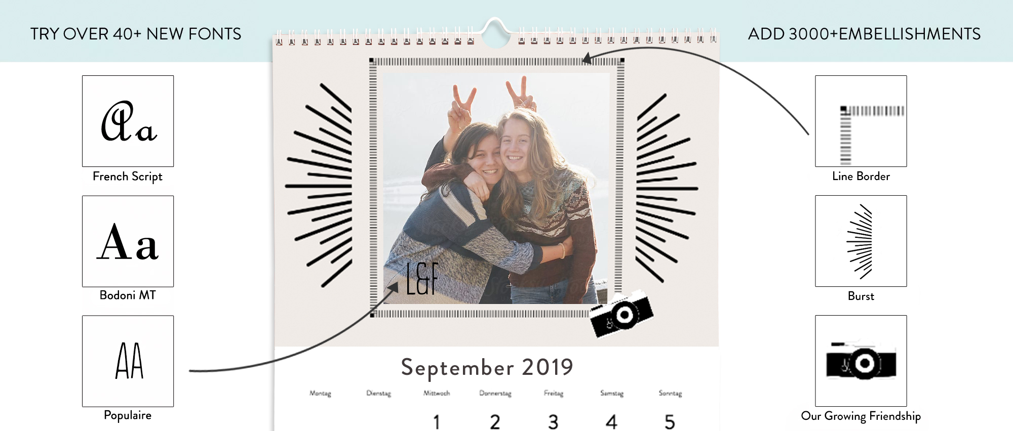 Mehr als 3000 Verzierungen und über 40 Designs stehen für ihren persönlichen und individuellen Kalender zur Auswahl